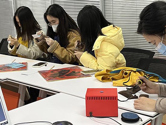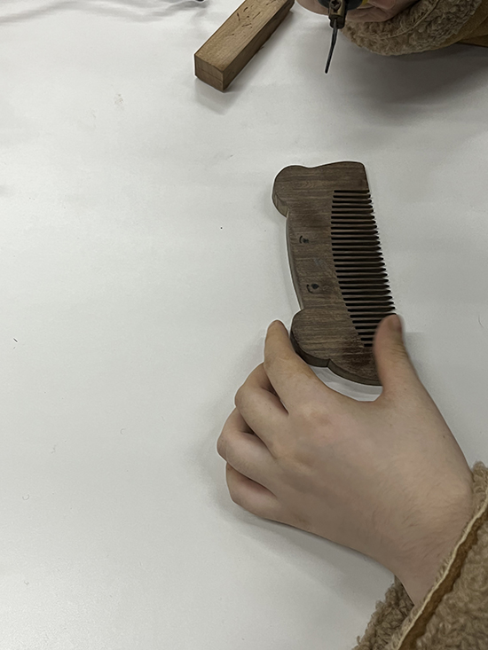 活動邀請了社區好老師錢娜進行講解授課,錢老師為大家展示了宋代半月梳,并講解檀木手作梳背后的傳統文化、歷史故事以及制作工藝。檀木梳子的制作包括選料、打磨、烙花、刻字、拋光等一系列過程。不少學員都通過手機搜索圖片,在木梳上臨摹宋代經典紋樣,希望制作出古色古香、韻味十足的木梳。最后的打磨也很考驗耐心,大家在老師的指導下從粗到細,從縱向到橫向……經過細細打磨,一把把檀木梳由原來的粗糙、黯啞變得細膩、光滑起來。