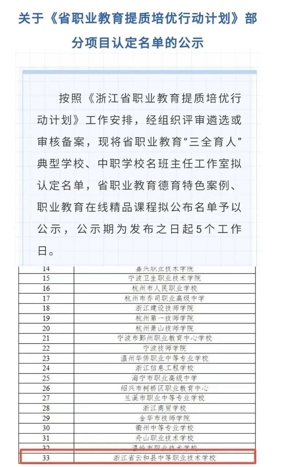 近日,《浙江省職業(yè)教育提質(zhì)培優(yōu)行動計劃》認定名單公示,云和縣中等職業(yè)技術(shù)學校榮獲浙江省職業(yè)教育“三全育人”典型學校。此次共遴選中等職業(yè)學校“三全育人”典型學校33個。