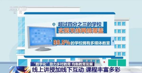 目前,全國中小學(含教學點)互聯網接入率達到100%,99.9%的學校出口帶寬達到100M以上,超過四分之三的學校實現無線網絡覆蓋,99.5%的學校擁有多媒體教室。數字化教學條件的不斷改善,有效助力了城鄉教育的均衡發展。