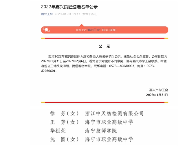 日前,由嘉興市總工會公布的2022年嘉興良匠擬入選和備選人員名單公示期結(jié)束。海寧市職業(yè)高級中學(xué)王芳、沈圓兩位教師成功入選。