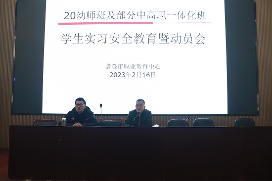 學生在拍攝好畢業合照后,參加了由教務處和招就處共同主持召開的20幼師班及部分中高職一體化班學生實習安全教育暨動員會。會上,教務處副主任宣志江向學生重點強調:實習是諸暨市職教中心實踐教學的重要環節,共計16學分。要求學生嚴格按照教務處下發的實習計劃,盡可能在專業相關實習崗位上認真開展實習,完成規定實習內容,撰寫實習日志,并在實習結束提交實習報告。學校將實習考核納入學業評價,考核成績將作為畢業的重要依據。招就處主任郭曙暉從實習安全和實習規范管理向學生提出了要求,要求學生務必遵紀守法,嚴格按照實習管理規定,注重安全,提高自我保護意識,認真完成實習方案規定的實習任務。