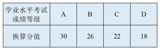 普高招生考生高中學(xué)考成績(滿分300分)=各科成績等級換算分值相加的總和(信息技術(shù)與通用技術(shù)學(xué)考分設(shè)的考生,信息技術(shù)與通用技術(shù)成績等級換算分值以50%計)。各科成績等級轉(zhuǎn)換成分?jǐn)?shù)如下表所示: