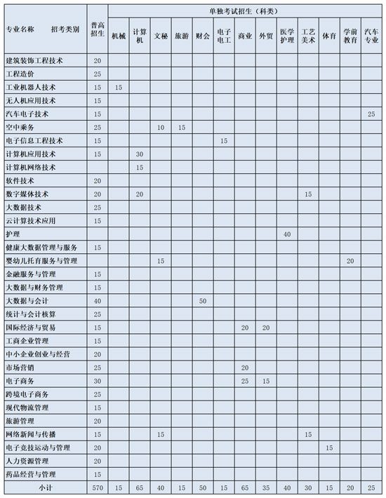 第八條 招生專業(yè)、科類及計劃。招生專業(yè)32個,招生計劃1000名。其中面向普高招生考生計劃570名,面向單獨(dú)考試招生考生計劃430名,學(xué)制均為三年,具體專業(yè)計劃如下表:
