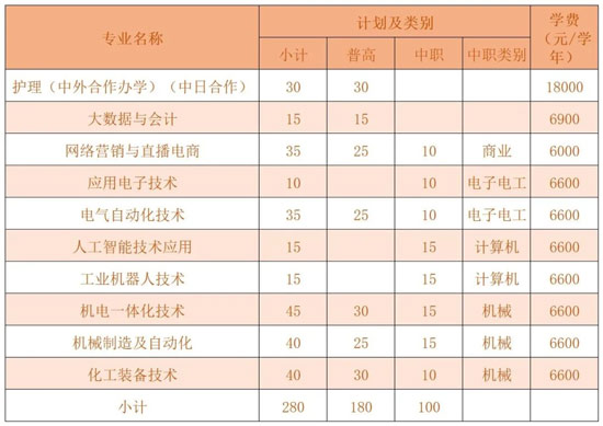 學校2023年高職提前招生總計劃280名,其中普高招生考生計劃180名,單獨考試招生考生計劃100名,具體如下: