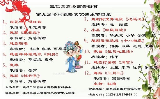 “太陽出來照四方,毛主席的話兒記心上......”2月17日,農(nóng)歷正月廿八晚,一曲紅歌拉開了遂昌縣三仁畬族鄉(xiāng)高碧街村春晚文藝演出的序幕。癸卯新年,疫情消散,畬族山鄉(xiāng)群眾歡欣鼓舞,為表達(dá)對黨中央的擁護(hù)和熱愛,歌頌偉大的祖國、偉大的黨,遂昌縣成人文化技術(shù)學(xué)校組織群眾文化演唱團(tuán)和高碧街村文藝愛好者精心排演,準(zhǔn)備了豐富的節(jié)目;當(dāng)晚,歌曲、舞蹈、小品、戲曲選段等輪番“上陣”,演出精彩紛呈,父老鄉(xiāng)親飽食“精神文化大餐”!