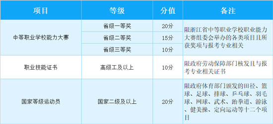 以上賦分為個人項目,其他所有團體項目成員按個人項目分值的50%計分。考生不同類項可累計賦分,但賦分最高分值累計不超過20分。素質特長項目賦分需經相關部門認定,學校招生領導小組審核后有效。