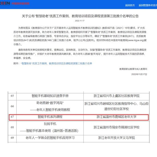教育部發(fā)布了《關(guān)于公布“智慧助老”優(yōu)質(zhì)工作案例、教育培訓(xùn)項(xiàng)目及課程資源第三批推介名單的公告》。溫州市鹿城區(qū)老年大學(xué)報(bào)送的智慧助老優(yōu)質(zhì)課程資源——《智能手機(jī)系列課程》成功入選。