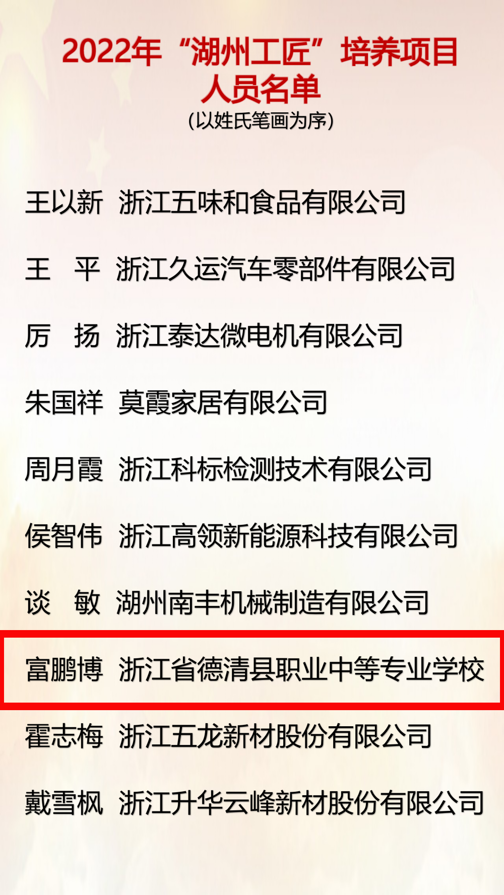 近日,湖州市人力資源和社會保障局、湖州市總工會公布2022年“湖州工匠”培養(yǎng)項目人員名單,德清職業(yè)中專服裝專業(yè)教師富鵬博成功入選!