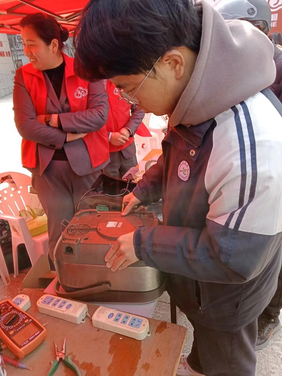 “老師,你幫我看看這個電飯鍋還能不能‘搶救’一下?”,“小師傅,我小孫子的這個小摩托車能幫忙看看問題出在哪里嗎?”服務現場,聞訊趕來的群眾陸陸續續從家中拿來不能正常運轉的電飯煲、電風扇、燒水壺等小家電,讓志愿者們“診斷”。志愿者們認真通過“望聞問切”查找故障原因,仔細分析每一件小家電存在的問題,利用所學技術處理檢查出的問題。同時,志愿者們還耐心地向大家講解家電日常使用和保養方法,普及用電安全知識,避免在使用過程中因不恰當的使用方法造成傷害及損失。一位老爺爺激動地說,“感謝小同學,幫我修好了刮胡器。能在職校學一門技術,真好,真好!”