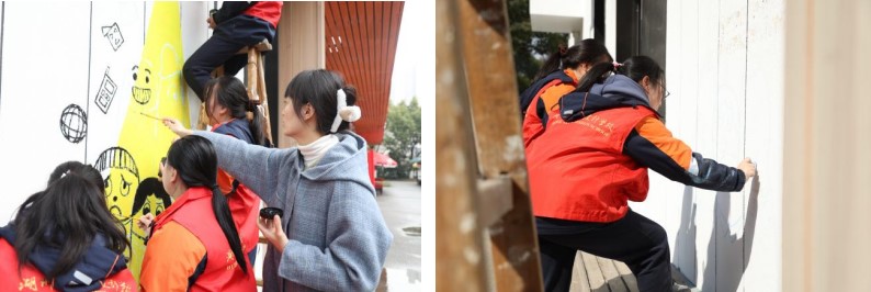 本次墻繪活動(dòng)主要內(nèi)容是在OTO創(chuàng)業(yè)體驗(yàn)中心的白色外墻上進(jìn)行繪制,為其增添色彩。接到任務(wù)后,同學(xué)們立馬著手準(zhǔn)備畫(huà)稿,查閱資料,根據(jù)要求策劃繪畫(huà)方案。同學(xué)們快速換好工作服,拿出準(zhǔn)備好的繪畫(huà)工具。大家分工明確,有的負(fù)責(zé)配色調(diào)色,有的負(fù)責(zé)描邊勾線,有的負(fù)責(zé)繪圖上色。繪畫(huà)過(guò)程中,同學(xué)們力求將每一處的顏料調(diào)出最真實(shí)的顏色,細(xì)心地勾勒出每一根線條,不放過(guò)任何一個(gè)細(xì)節(jié)。看著完成的墻繪作品,同學(xué)們的自豪感油然而生。