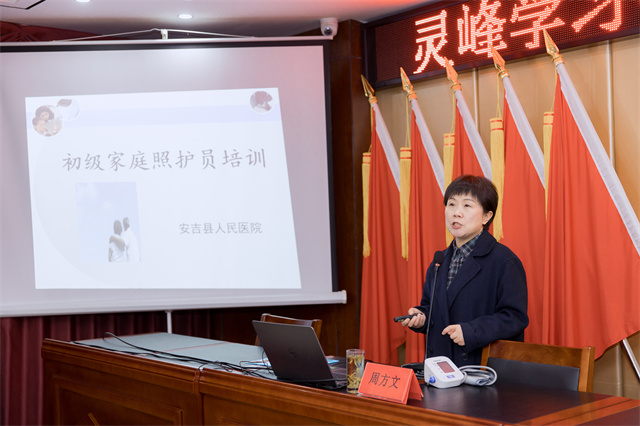 培訓(xùn)由安吉縣人民醫(yī)院二級心理咨詢師周方文主講。周方文圍繞口腔清潔、體溫測量、血壓測量、幫助臥床老人翻身、排便等老年人基本護(hù)理的六大技能進(jìn)行講解,講解過程中還邀請學(xué)員們上臺進(jìn)行模擬訓(xùn)練。學(xué)員們學(xué)得很認(rèn)真。