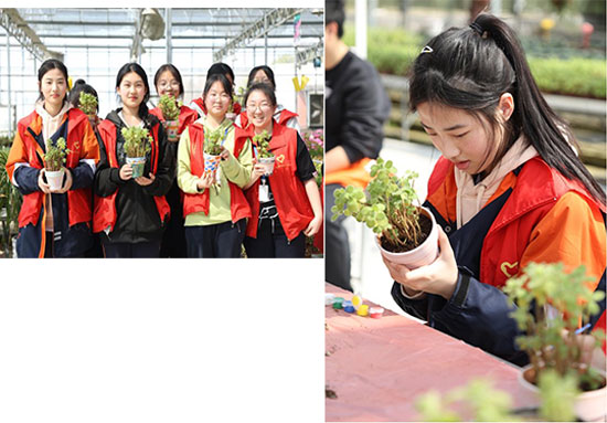 種植完樹苗,老師帶領同學們參觀花卉大棚。在這里,同學們看到了許多植物,有生長在沙漠的龍舌蘭、仙人掌,還有生長在室內的橡皮樹,看到各種各樣的植物大家都感到十分新奇。接下來的碰碰香栽培環節。講解老師為大家講解碰碰香相關的知識以及扦插栽培的要點與技巧,同學們也開始嘗試自己動手扦插碰碰香。分根、換土、裝盆,遇到不會的環節就尋求老師的幫助。最后是繪畫花盆環節,同學們都專注地為自己的花盆增添圖案與色彩,每一盆都是獨一無二的碰碰香。(莫衛麗)