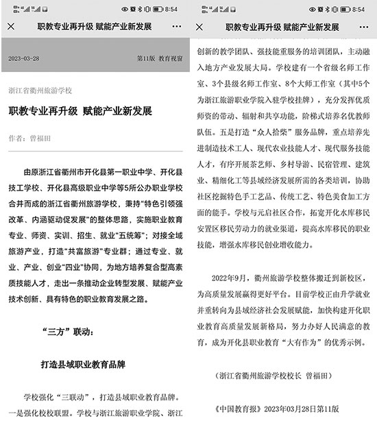 3月28日,《中國教育報(bào)》以《職教專業(yè)再升級(jí),賦能產(chǎn)業(yè)新發(fā)展》為題,全面報(bào)道了學(xué)校近年來的辦學(xué)成果。在衢州職業(yè)教育“五統(tǒng)籌”的引領(lǐng)下,圍繞縣委縣政府提出的“四業(yè)”(專業(yè)、產(chǎn)業(yè)、就業(yè)、創(chuàng)業(yè))協(xié)同,實(shí)施“五項(xiàng)”行動(dòng)——“匠心育人”黨建品牌、“共富旅游”專業(yè)品牌、“尚美少年”德育品牌、“桃園幫”團(tuán)隊(duì)品牌、“眾人拾柴”服務(wù)品牌。