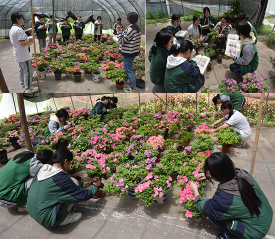 “這邊的花盆位置要再調整一下……注意顏色和高低的錯落……”園藝專業的老師們仔細叮囑2113班的同學們,力求最完美呈現杜鵑花的魅力。同學們認真布展,一絲不茍,把農藝課堂上的專業、細心、嚴謹一展無余。