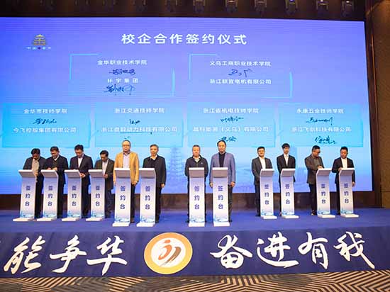 作為省一流技師學(xué)院建設(shè)單位,永康五金技師學(xué)院與浙江交通技師學(xué)院、浙江省機電技師學(xué)院、金華技師學(xué)院參加了當(dāng)日的高技能人才培養(yǎng)成果展。永康五金技師學(xué)院黨委書記曹法余出席大會,院領(lǐng)導(dǎo)馬林剛代表學(xué)院與浙江飛劍科技有限公司代表上臺簽約。