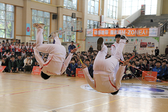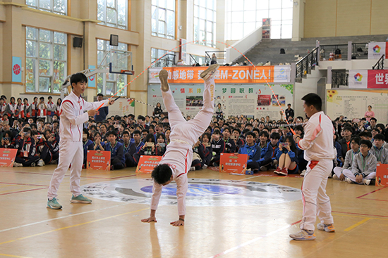 賽前,“世界冠軍進校園活動”請來了世界跳繩冠軍段中飛及其團隊,他們表演的花樣跳繩令人目不暇接,引發(fā)同學們陣陣驚嘆。