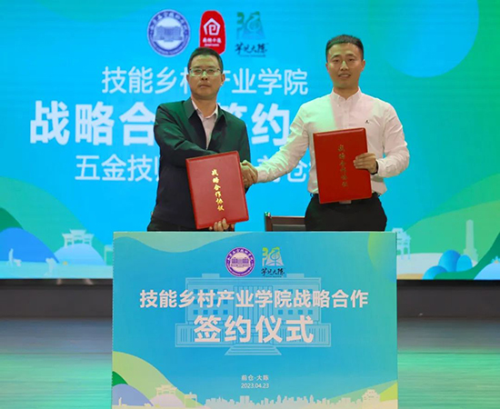 在熱烈的掌聲中,盧忠健與吳勇共同簽訂“技能鄉村產業學院”戰略合作協議。