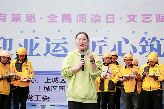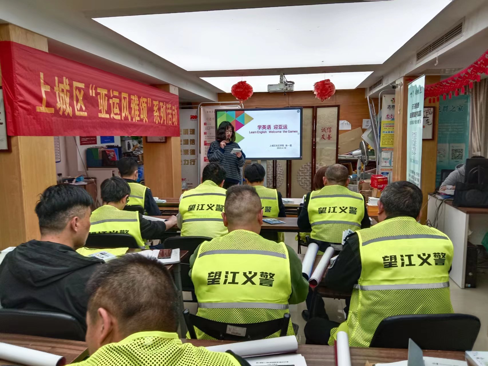 4月12日下午,在望江街道新世界工地,來自天地實驗小學(xué)的志愿者趙媛老師面向建筑工人進(jìn)行了亞運(yùn)英語的培訓(xùn)。建筑工地就在地鐵站旁邊,趙媛老師設(shè)計了外國友人向工友們咨詢?nèi)绾吻巴罔F站的情景,教工友們進(jìn)行沉浸式體驗學(xué)習(xí)。工友們學(xué)得很認(rèn)真,表示受益匪淺,平時也要多練習(xí),為亞運(yùn)出一份力。