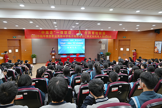 為加快推進現代職業教育體系建設,深化臨平商貿職業高級中學產教融合,促進教育鏈、人才鏈與產業鏈、創新鏈有效銜接,4月26日下午,由臨平區教育局主辦、臨平區校地辦與杭州市臨平商貿職業高級中學共同承辦的“中高企”一體化電子商務專業訂單式協同育人簽約儀式順利舉行。浙江經濟職業技術學院商貿流通學院院長汪永華、副院長方文英,杭州老板電器股份有限公司黨委副書記唐根泉,臨平區教育局調研員周順芳,臨平區商務局黨委委員、副局長錢江,臨平區校地辦負責人沈金燕,臨平區商務局電子商務科科長郭帥,臨平區教育局基礎教育科副校級視導員沈美華,杭州市臨平商貿職業高級中學校長朱慧明、黨委書記邵曉舟、副校長張光升及師生代表共同出席儀式,儀式由學校副校長查文婷主持。