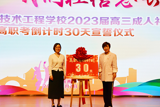 隨后,嘉善信息技術工程學校副校長丁蕾和教務處主任趙愛琴為高職考倒計時30天揭牌。高職考在即,相信高三的同學們定能以嚴肅認真的態度復習備考,以高昂的斗志、飽滿的精神沖刺高考,收獲成功。
