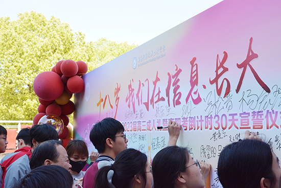 踏上紅地毯,走過成人門,在簽名墻前留下自己的簽名,高三學子攜手最親愛的家人來到大報告廳內。在莊嚴的國歌聲中,高三年級成人儀式暨高職考倒計時30天宣誓儀式正式拉開序幕。