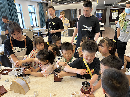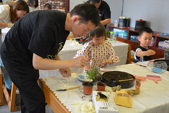 在旅游與酒店職業體驗中心,濃濃的咖啡香一下子吸引了大家。小朋友們齊動起手,試試研磨咖啡豆,了解手沖咖啡的故事。參觀了盤扣實訓室里精美的非遺盤扣作品,大家一起坐下來聽敖素燕老師帶來精彩的微景觀制作課堂。孩子們和爸爸媽媽一起,認真聆聽,并在老師指導下,動手制作獨一無二的作品。