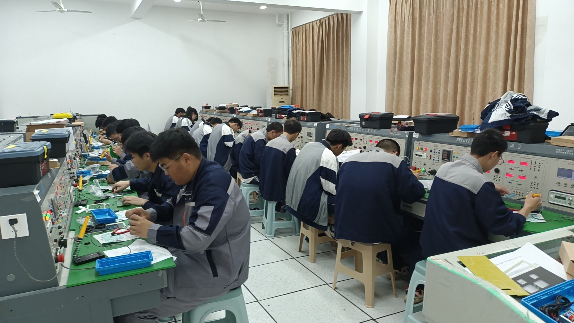 在電子電器應(yīng)用項(xiàng)目現(xiàn)場(chǎng),學(xué)生們沉穩(wěn)地動(dòng)手展示電子產(chǎn)品焊接、組裝,全面展示出專業(yè)技能操作能力。