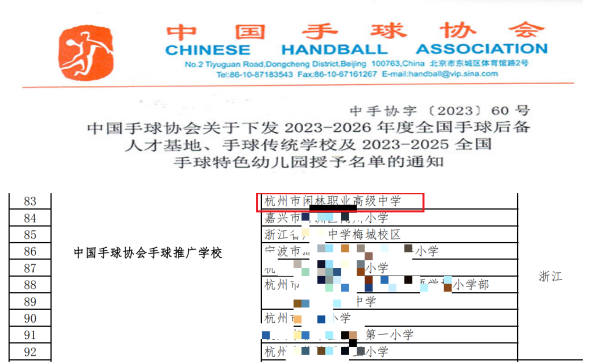 近日,中國手球協會官方網站公布了《2023-2026年度全國手球后備人才基地、手球傳統學校及2023-2025全國手球特色幼兒園授予名單》,閑林職高成為浙江省唯一一所入圍的中職學校。