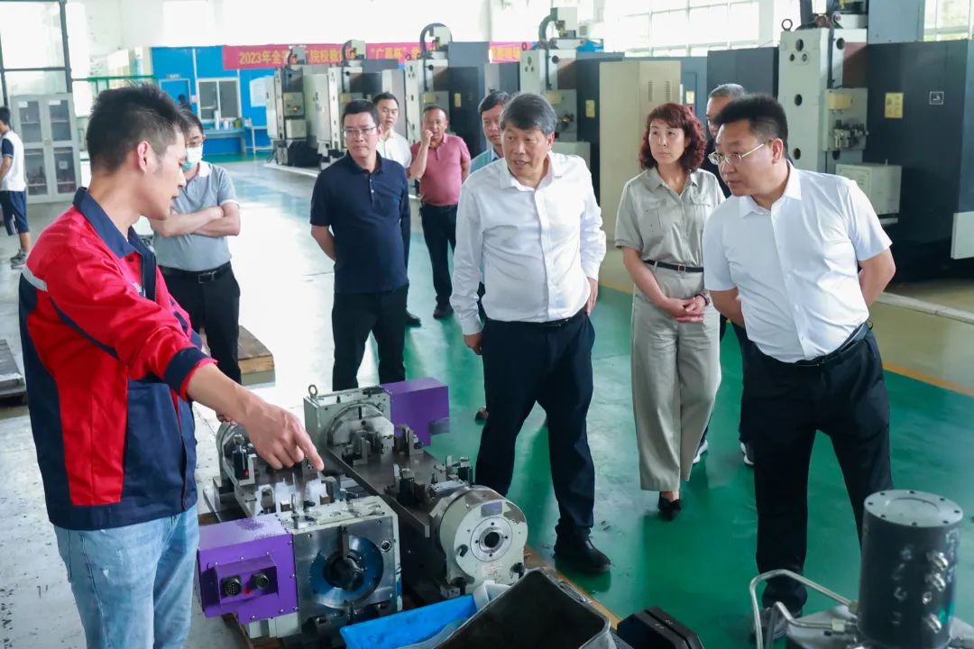 參觀了國際會展中心的世界五金精品館后,考察團隨即前往五金產業技能人才培養基地:永康職技校、永康五金技師學院。在學校的產學研中心,眾人走訪了實驗室、車間、技術研發中心等區域,校領導王鐘寶、吳勇、胡贊等向來賓介紹了學校發展現狀、人才培養模式、產教融合成果與“東遷西歸”項目推進現狀。