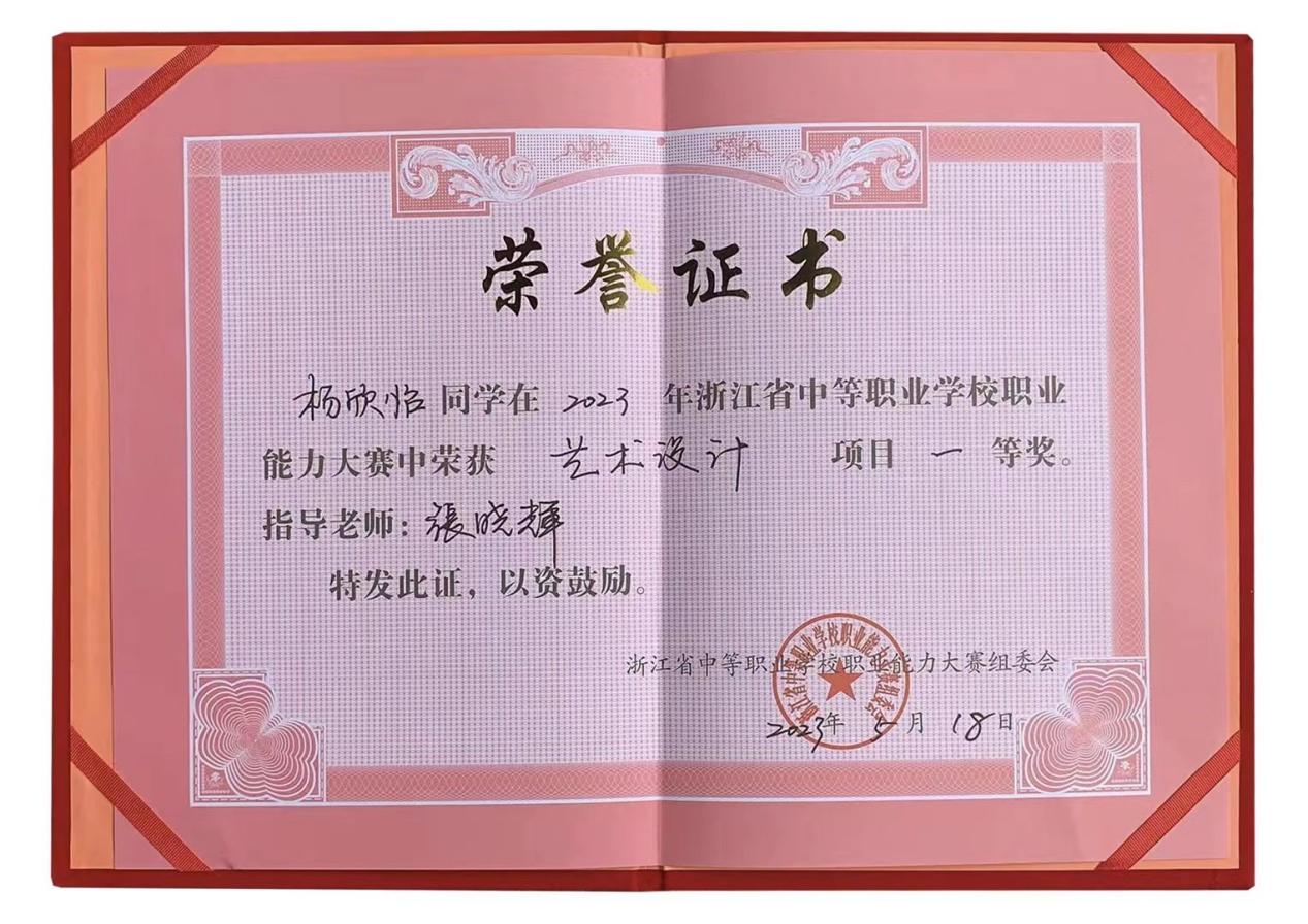 2023年5月17日,浙江省湖州藝術與設計學校工美專業部楊欣怡同學在浙江省中等職業能力大賽藝術設計賽項中,憑借扎實的基本功和優異的表現脫穎而出,以本賽項最高分奪得一等獎。