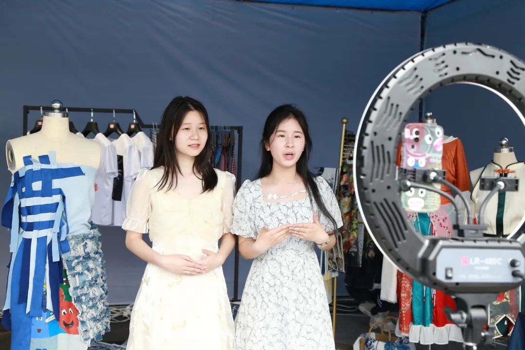 動態區由手工蠟染和電商直播展示兩部分組成。染整專業的同學們將自己設計好的圖案,用蠟塊和蠟筆流轉成為布料上的美麗印花,再進行染色、熨燙等。而電商專業的學生便將這些蠟染工藝品帶入直播間,通過精彩的講解和實實在在的訂單成交量為他們的作品打call。