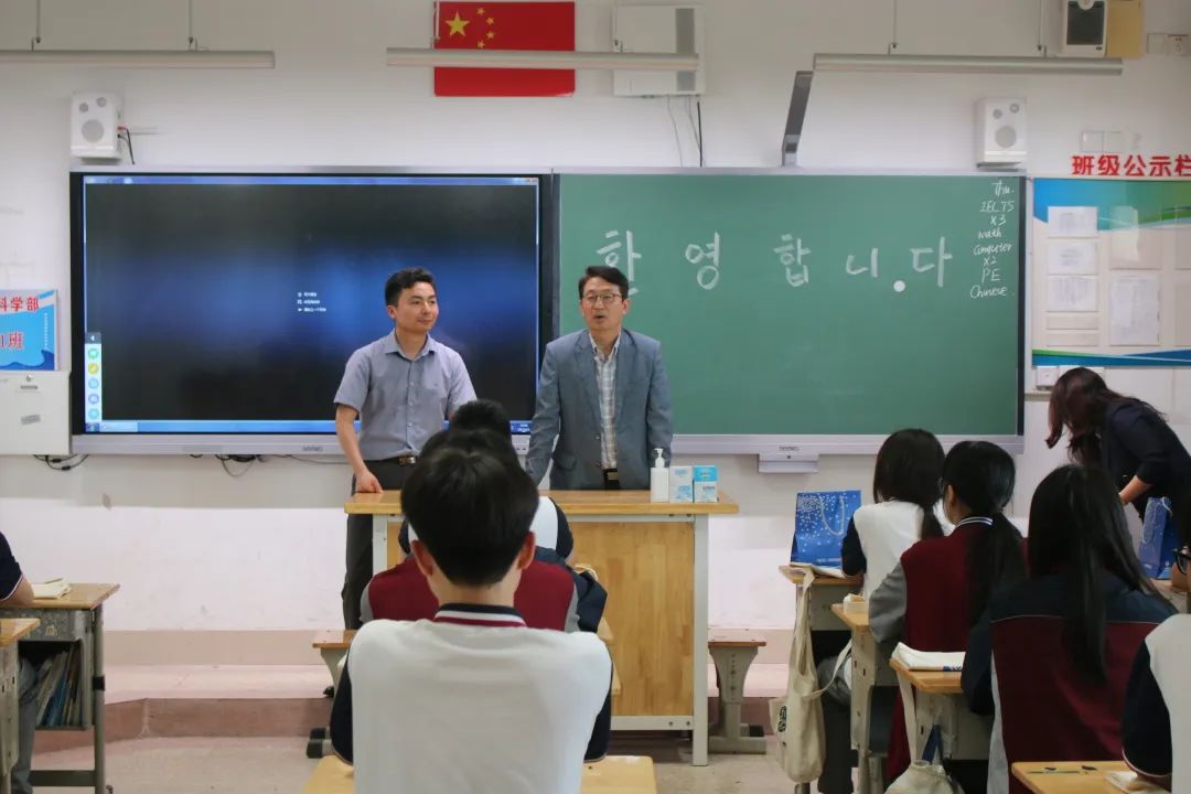 李東烈一行還特意到第三教學樓看望中外合作班的學生,贊賞同學們留學韓國的選擇。同行的山高陽教授向同學們介紹了亞洲大學的軟件工程專業。兩位遠道而來的客人為同學們現場答疑解惑,并送出來自韓國的祝福。