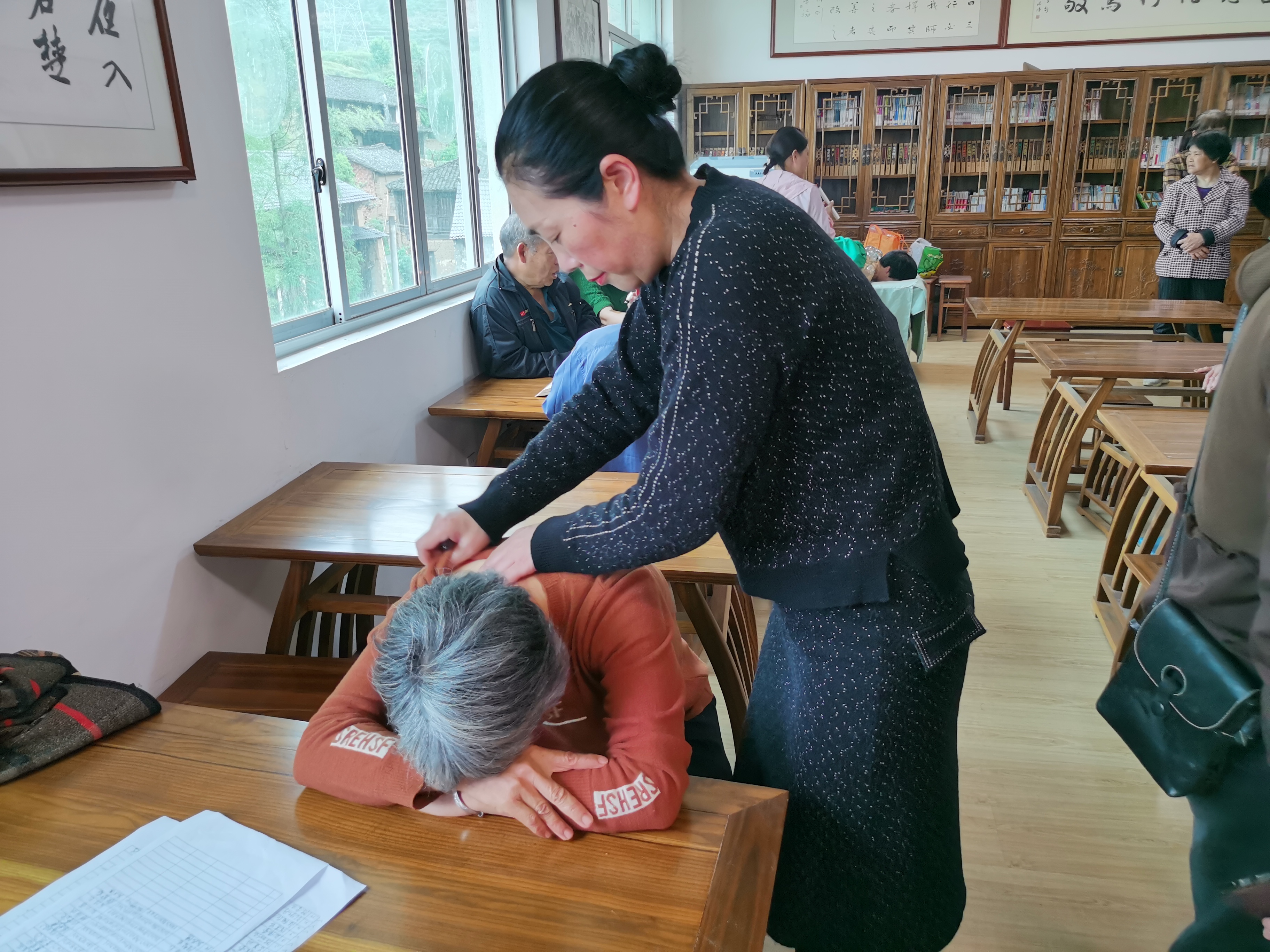 6月6日下午,大盤鎮禮濟村文化禮堂一派熱鬧景象,30多位老人圍在兩位授課老師身邊,享受愛心健康服務。