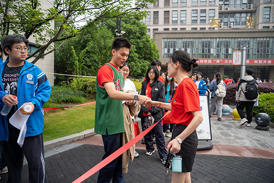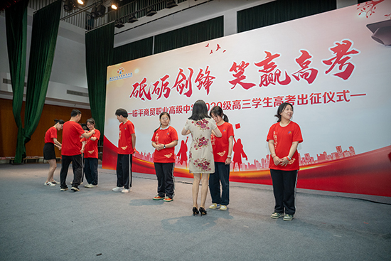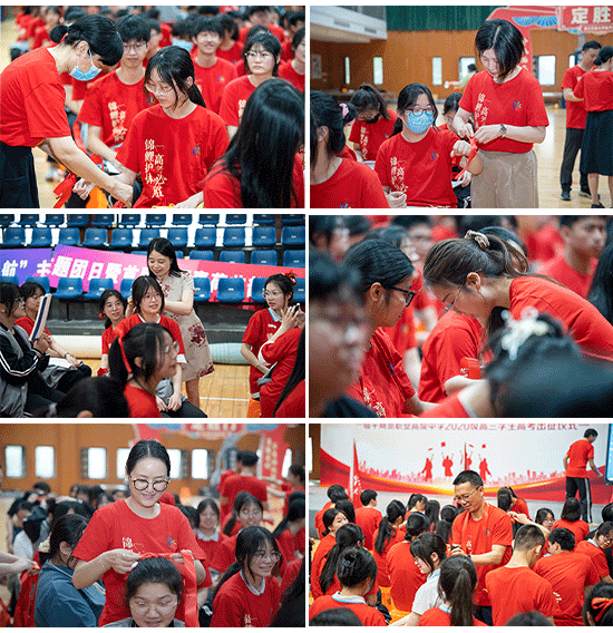 各班學生代表為大家送上考前祝福,祝愿同學們旗開得勝,高考必勝!班主任們帶著期許,為學生代表系上寓意高考必勝的紅絲帶。