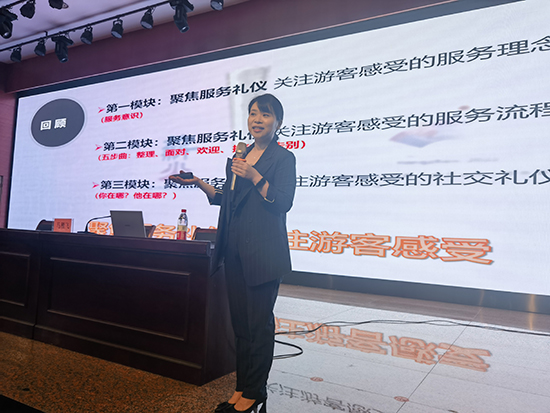 簡短的開幕式后,進行了緊鑼密鼓的培訓。國家級金牌導游、杭州科技職業技術學院研學旅行管理與服務專業負責人余云建講師以“從亞運‘江南憶’看杭州三‘世遺’”為主題,進行富陽鄉村旅游講解技巧的傳授。杭州科技職業技術學院朱永文副教授則緊密聯系富陽區旅游景點與文化,深入淺出地講解“如何創作導游詞”。金牌導游卓越培訓師、浙江旅游職業學院旅行服務與管理學院韓德瓊講師利用自己豐富的工作經歷,通過一個個典型案例,給學員們分析比賽中出現的問題和困惑,進行導游比賽賽前職業技能指導。高級禮儀師、杭州科技職業技術學院馬雁飛講師給學員們帶來了《亞運有禮》,從導游服務接待禮儀、儀容儀表等方面做深入精彩的指導。富陽區職業教育中心高級講師許燕華帶領學員學習“亞運英語”,以飽滿的熱情進行口語練習,掀起學英語的熱潮。