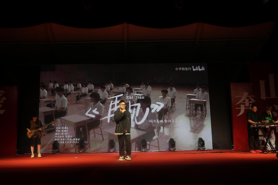 班主任代表吳佳林老師和卜婧婧老師驚喜地從學生叢中走向舞臺,一首《鳳凰花開的路口》送給全場畢業生。