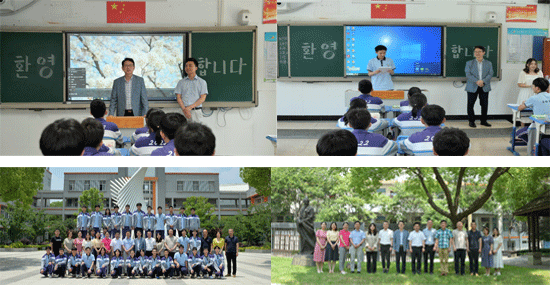 在丁校長的陪同下,李院長一行看望合作項目的學生。學生代表全程用韓語介紹班級情況、高中生活和未來對大學的憧憬,李院長對學生們的熱情和高素養表示高度地贊揚。他向學生介紹韓國亞洲大學的教學環境和辦學條件,鼓勵學生在高中努力學習,以最佳的姿態升入大學。山高陽教授還向學生們介紹相關專業,并積極為學生們答疑解惑,還帶來來自韓國的祝福。