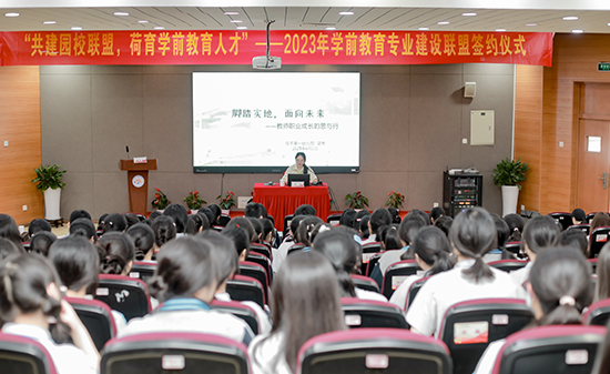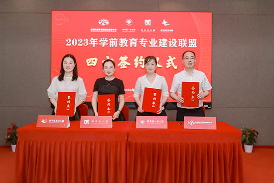 四方領(lǐng)導(dǎo)上臺(tái),共同簽署學(xué)前教育(幼兒保育)專業(yè)建設(shè)聯(lián)盟合作協(xié)議。