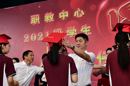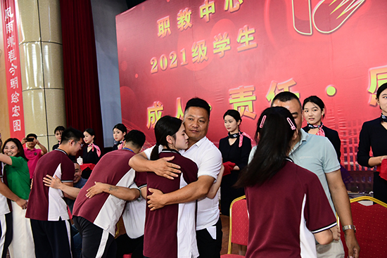 隨后,在周一妹老師的領(lǐng)誓下,全體高二學(xué)生面對(duì)國(guó)旗,莊嚴(yán)宣誓。在感恩父母環(huán)節(jié),學(xué)生代表上臺(tái)向父母行鞠躬禮,獻(xiàn)感恩茶。在這個(gè)特殊的時(shí)刻,讓同學(xué)們感恩父母,感謝家長(zhǎng)賦予孩子生命,感謝家長(zhǎng)撫育孩子成長(zhǎng)。老師是園丁,育得桃李芬芳;學(xué)生是花朵,在精心澆灌下茁壯成長(zhǎng)。站在成人的門檻上,班主任老師們又送來(lái)了成人寄語(yǔ)。朝夕相伴了兩年,一束鮮花,一個(gè)擁抱,一切盡在不言中。21電商1班王婷婷作為學(xué)生代表發(fā)表成人心聲,她感謝兩年來(lái)父母、老師、同學(xué)、學(xué)校給予的支持與愛(ài),在未來(lái)的日子,自己將懷揣著夢(mèng)想,緊握著希望,挺起堅(jiān)實(shí)的胸膛,昂首面對(duì)已經(jīng)成年的自己,在未來(lái)的人生之路上,披荊斬棘,挑戰(zhàn)極限。21計(jì)4鐘凱怡父親鐘正平作為家長(zhǎng)代表上臺(tái)發(fā)言,他希望每一位同學(xué)要學(xué)會(huì)獨(dú)立思考世界、感受生活、實(shí)踐目標(biāo),同時(shí)學(xué)會(huì)如何愛(ài)護(hù)自己、尊重他人、遵守社會(huì)公德,并且學(xué)會(huì)帶著感恩和欣賞的眼睛來(lái)發(fā)現(xiàn)這個(gè)世界的美好。孫良杰代表學(xué)校深情寄語(yǔ)。孫校長(zhǎng)希望全體高二學(xué)生在以后的人生道路上,多掌握生存的技能、多學(xué)習(xí)生活的知識(shí)、多理解生命的意義,在青春時(shí)用腳步丈量世界,用眼睛發(fā)現(xiàn)美好,用耳朵傾聽(tīng)呼聲,用內(nèi)心感應(yīng)變化,把對(duì)家國(guó)血濃于水、與時(shí)代同呼吸共命運(yùn)的情感貫穿學(xué)業(yè)全過(guò)程、融匯在事業(yè)追求中。