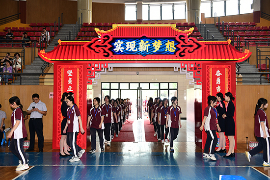 楊藝超宣布2021級(jí)學(xué)生成人門儀式正式開始,在背景音樂(lè)中,同學(xué)們排著整齊的隊(duì)伍緩緩入場(chǎng)。同學(xué)們和班主任手挽手,一起邁著堅(jiān)實(shí)的步伐,從寫著“邁入成人門,實(shí)現(xiàn)新夢(mèng)想”的巨大成人門下走過(guò),象征著同學(xué)們跨過(guò)十八歲的門檻,即將成長(zhǎng)為有責(zé)任感、有感恩心、有奉獻(xiàn)精神的新公民。