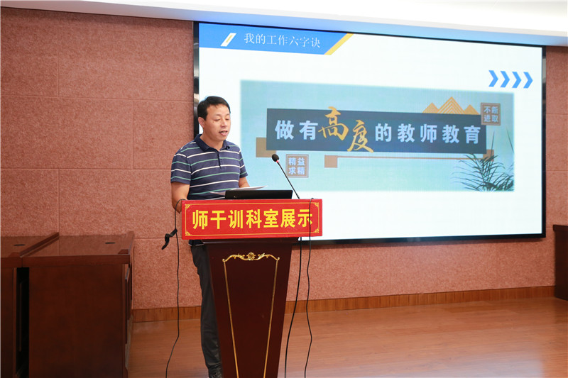 長(zhǎng)興教師進(jìn)修學(xué)院師干訓(xùn)科室承擔(dān)著全縣中小學(xué)幼兒園教師專業(yè)發(fā)展培訓(xùn)工作,為進(jìn)一步提升科室成員的工作能力和反思意識(shí),達(dá)成“做有高度的教師教育”這一目標(biāo),6月20日下午,學(xué)院開展師干訓(xùn)科室“我的本職工作我來談”展示活動(dòng),活動(dòng)由副院長(zhǎng)周世強(qiáng)主持,全體教師參加學(xué)習(xí)。