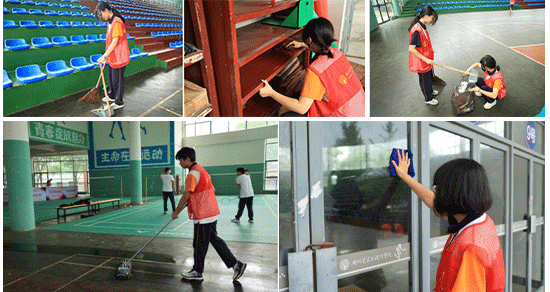 二十余名志愿者依照分工,打掃體育館和器材室各個區域、角落,大家充分發揮不怕苦、不怕累、不怕臟的精神,認真打掃體育館內羽毛球場、看臺、看臺過道、欄桿以及器材室的各物品架及門窗,不放過死角。大家各司其職,互幫合作,不到一小時,整個場館的面貌煥然一新。