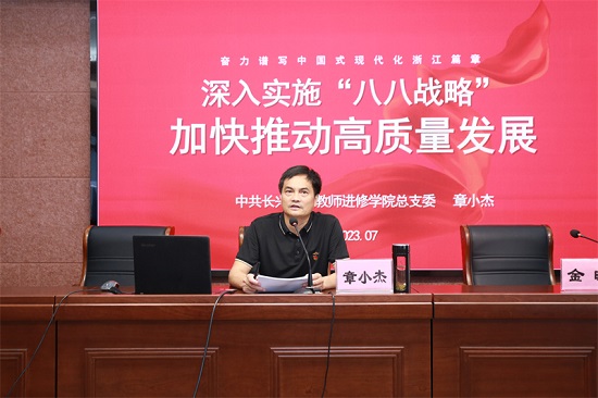 黨課前的集體宣誓儀式上,全體黨員面對黨旗莊嚴宣誓,表達了對黨的忠誠和對黨的信仰堅定。為了深入理解實施“八八戰略”,加快助推學院高質量發展步伐,學院黨總支書記章小杰給黨員同志們上了一堂生動的黨課,他深入淺出地向大家講解了“八八戰略”所蘊含的優勢論、問題論等理論知識,并結合學院發展當前面臨的困難、發展愿景和高質量發展目標,提出努力在六個方面“下功夫”,即環境建設在精致性、文化性上下功夫,隊伍建設在主動性、專業性上下功夫,機制建設在融合性、發展性上下功夫,質量建設在生態性、優質性上下功夫,品牌建設在創新性、典型性上下功夫,號召全體黨員要始終保持辦學初心,做好自己,接續奮斗,實干爭先,共創學院發展新境界。