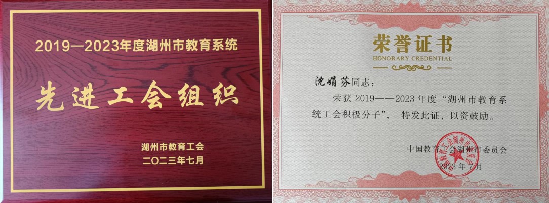 會議表彰了五年來全市各級工會先進集體和個人,浙江省湖州藝術與設計學校工會榮獲“2019—2023年度湖州市教育系統先進工會組織”榮譽稱號,沈娟芬同志榮獲“2019—2023年度湖州市教育系統工會積極分子”稱號。
