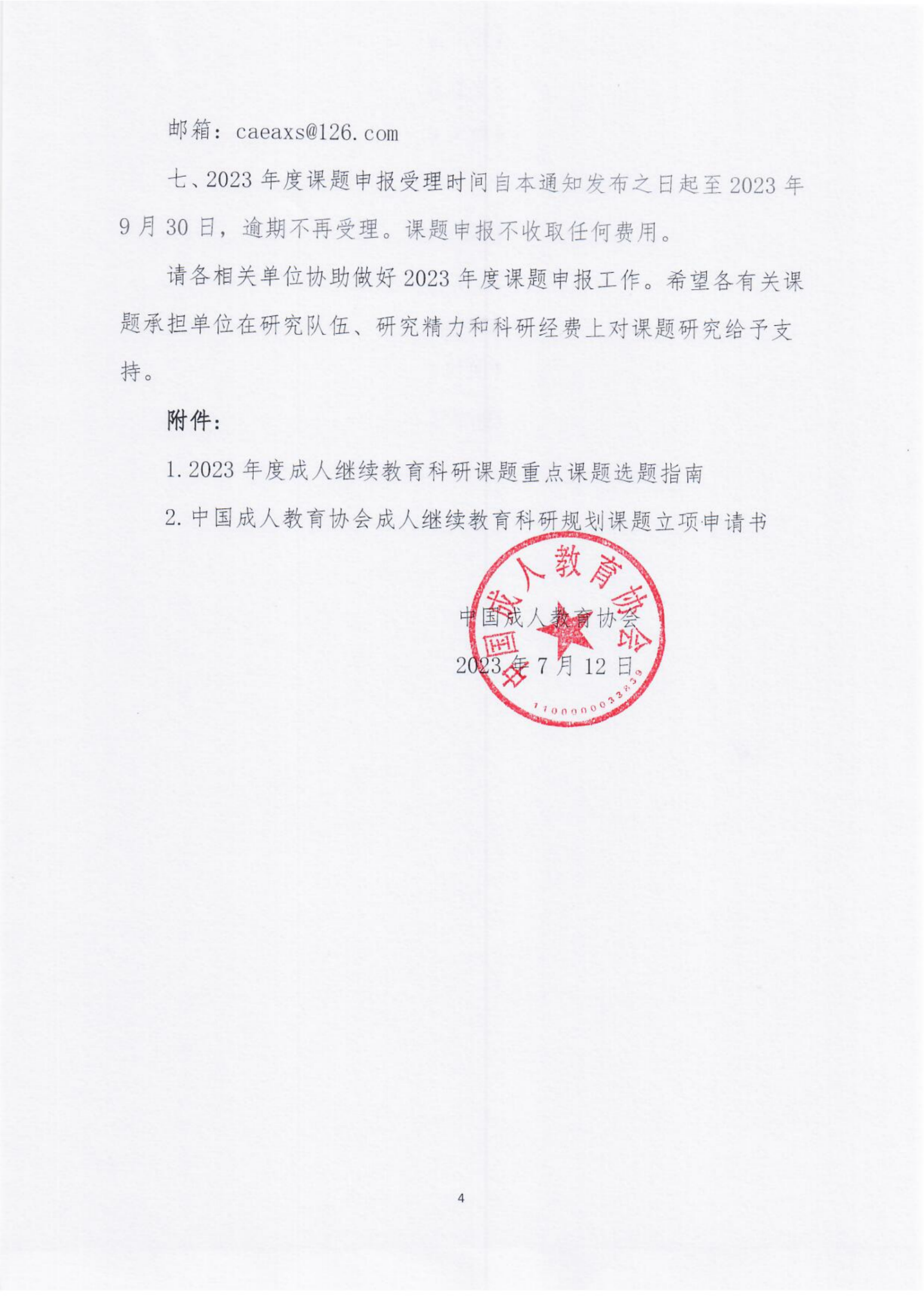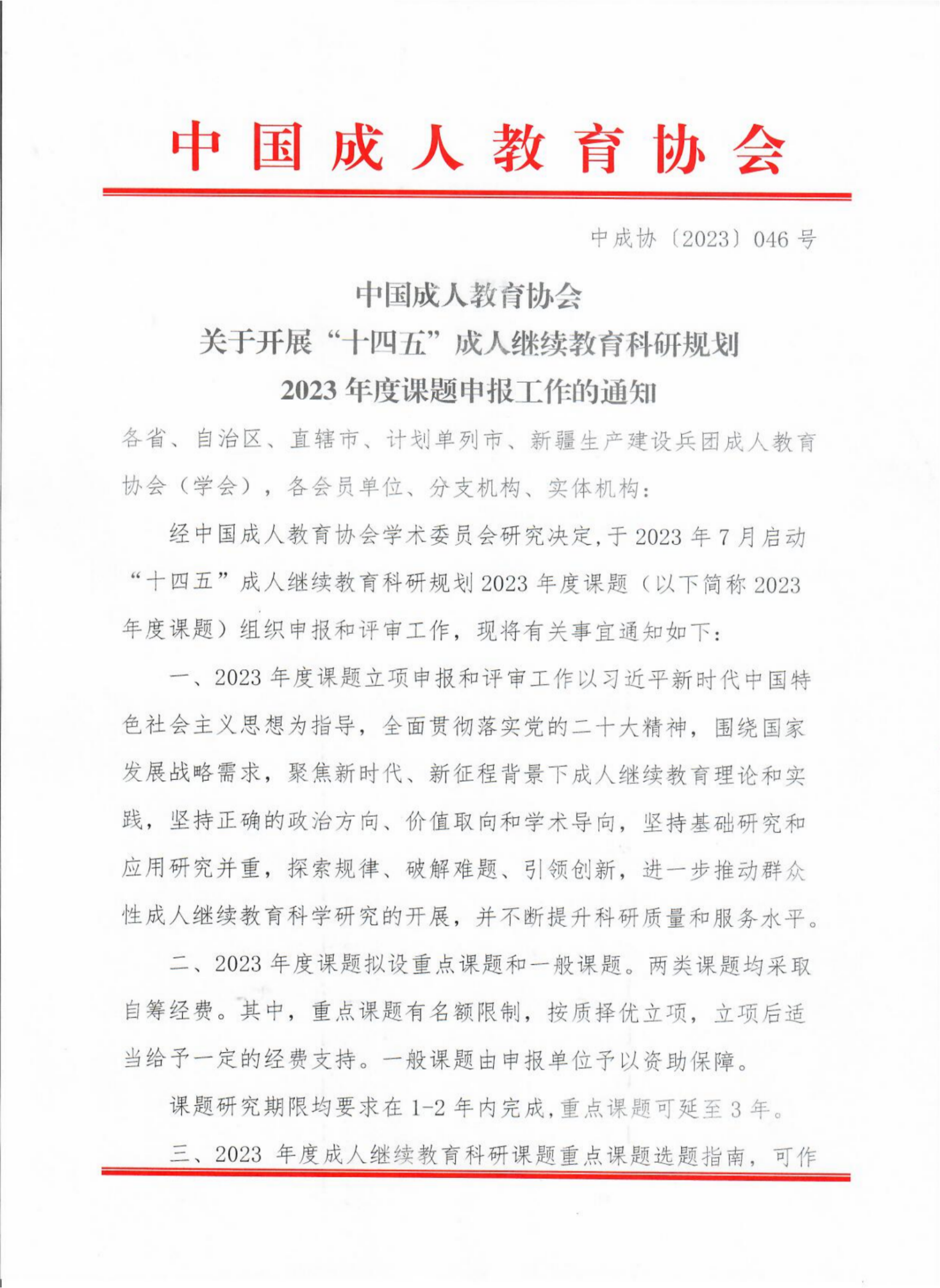 附件:《中國成人教育協會關于開展“十四五”成人繼續教育科研規劃2023年度課題申報工作的通知》(中成協[2023]046號)