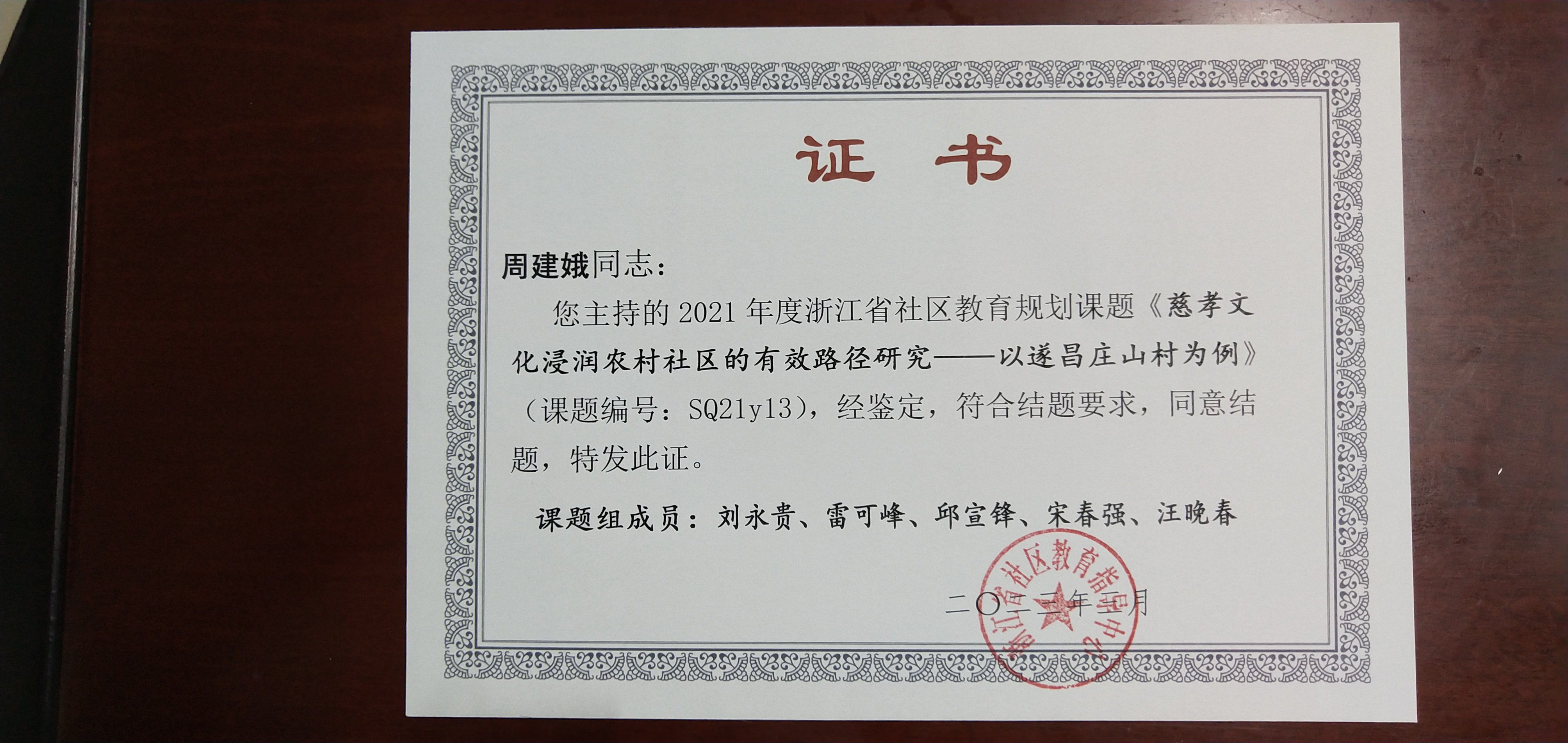 日前,遂昌中心成技校妙高分校收到浙江省社區教育指導中心發來的證書:由周建娥主持的2021年度浙江省社區教育規劃課題《慈孝文化浸潤農村社區的有效路徑研究—以遂昌莊山村為例》符合結題要求,同意結題。