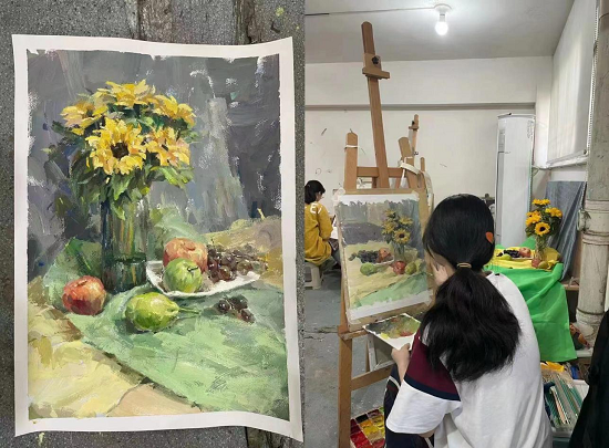 王安睿以前就對美術感興趣,但真正接觸、學習還是進入職高的工美專業之后。從去年12月的市賽第一,到今年5月的省賽第一,備賽過程忙碌而辛苦,她每天都沉浸式練習素描、色彩,做圖案設計,記錄每天的想法與靈感。指導老師、班主任周淑苗非常欣賞這名愛徒,“她很有美術天賦,靜得下來,學會思考,畫不下去時會跟老師請教、交流,總能快速吸引內化滋養”。