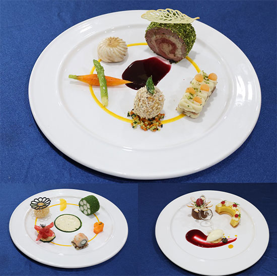 海寧技師學院參賽菜品的研發、構圖、配色、調味等充滿亮點和創新,這是贏得裁判青睞的原因之一。指導老師張燕老師說:“我們在設計時加入了一些地域元素,考慮了海寧‘潮文化’元素,更具自然寫意;在配色上,使用了更能激發食欲的紅、黃;口味上注重健康,平和、清淡……”。