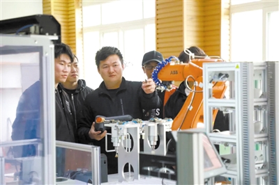 ①工業機器人技術專業教師孫濤(中)在實訓現場給學生講解。學校供圖