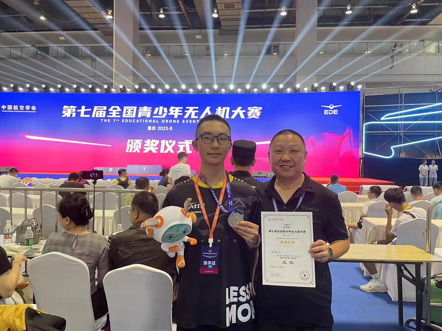 成績的取得離不開艱辛的付出與努力。從6月份開始,學校組建帶訓師資隊伍,籌措比賽設備,搭建模擬賽場,全力備賽第七屆全國青少年無人機大賽。學校5名選手7月以優異的成績在省賽中獲得國賽資格后,在指導教師的帶領下復盤技術要領,精扣操控細節,刻苦操練。“到了國賽圈技術能力都是一等一,只有做到極致才能對得起學校、對得起家長。”選手王一博說。功夫不負有心人,公告成績“22秒13”,王一博同學站上了青少年無人機技能的最高領獎臺,成功獲得國賽亞軍。正如他所說,因為熱愛而努力,因為熱愛而奮斗,因為熱愛而堅持不懈,因為熱愛而渴望成功,我熱愛無人機事業,在傾注了無數的汗水與心血之后,終于等來了它成長花開的那一刻。